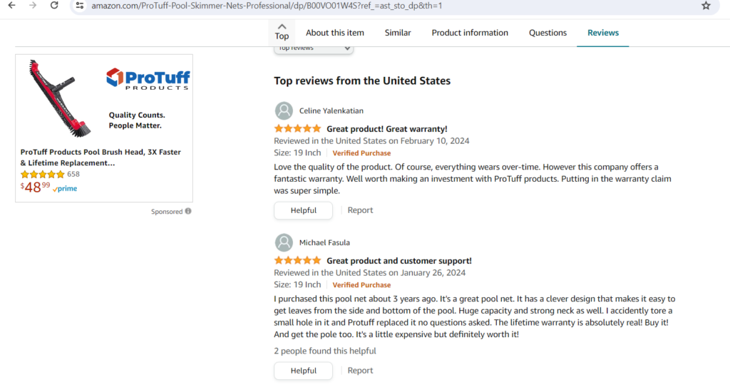 Michael Fasula, a satisfied ProTuff customer, shared his experience, stating, “I purchased this pool net about 3 years ago. It’s a great pool net. It has a clever design that makes it easy to get leaves from the side and bottom of the pool. Huge capacity and strong neck as well. I accidently tore a small hole in it and Protuff replaced it no questions asked. The lifetime warranty is absolutely real! Buy it! And get the pole too. It’s a little expensive but definitely worth it!”
